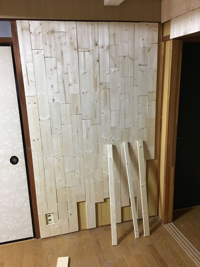 こちらの壁はランダムにパイン材を直接壁に貼り付けて板壁に仕上げている最中です。